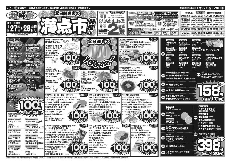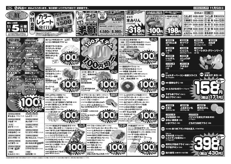 毎週月曜日は青果の日 毎週火曜日はシルバーデー 毎週水曜日は100円均一 毎週水曜日はカラーレシート発行日 毎週木曜日はポイント券ご使用日 毎週金曜日は玉子の日 毎週土曜日は100ポイント券ご使用日 毎月15日は特別シルバーデー 月~金曜日子育て応援の日 |