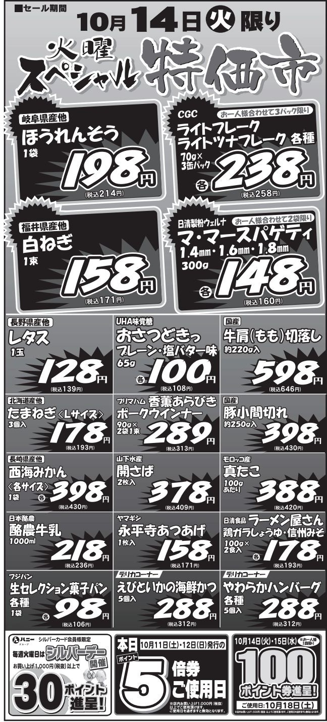 毎週月曜日は青果の日 毎週火曜日はシルバーデー 毎週水曜日は100円均一 毎週水曜日はカラーレシート発行日 毎週木曜日はポイント券ご使用日 毎週金曜日は玉子の日 毎週土曜日は100ポイント券ご使用日 毎月15日は特別シルバーデー 月~金曜日子育て応援の日 |