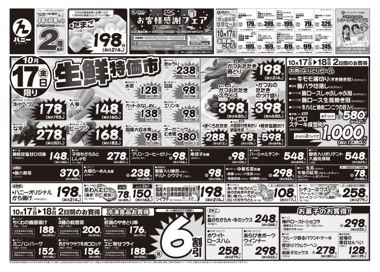 毎週月曜日は青果の日 毎週火曜日はシルバーデー 毎週水曜日は100円均一 毎週水曜日はカラーレシート発行日 毎週木曜日はポイント券ご使用日 毎週金曜日は玉子の日 毎週土曜日は100ポイント券ご使用日 毎月15日は特別シルバーデー 月~金曜日子育て応援の日 |