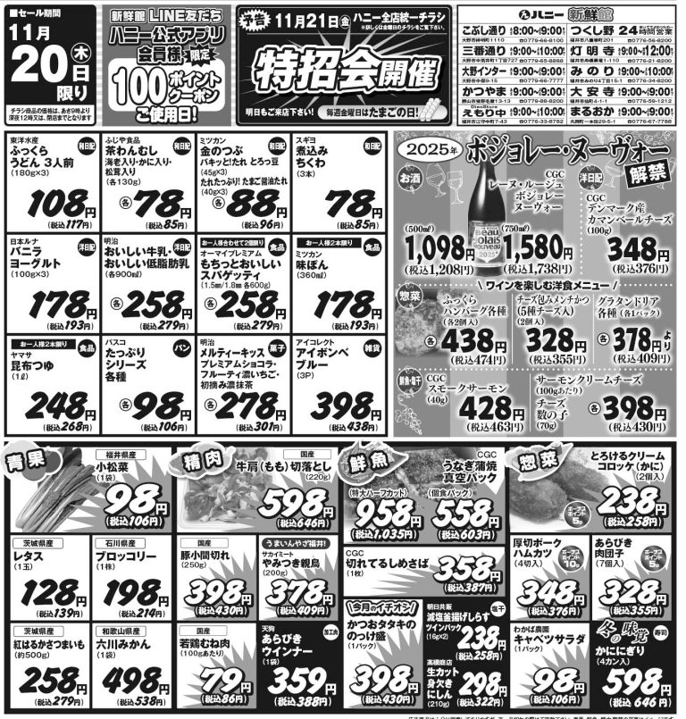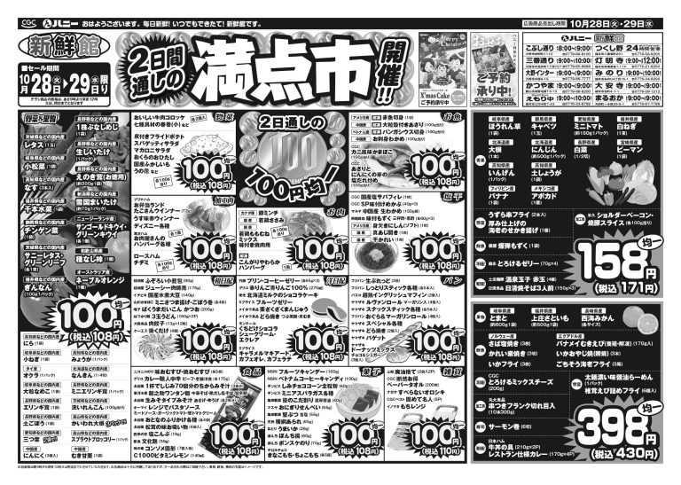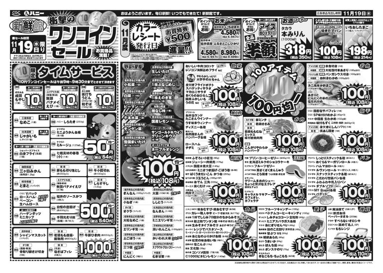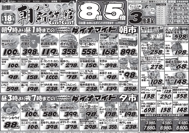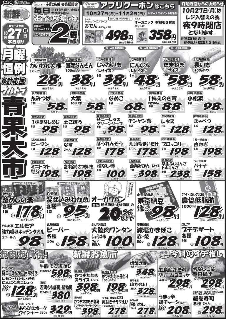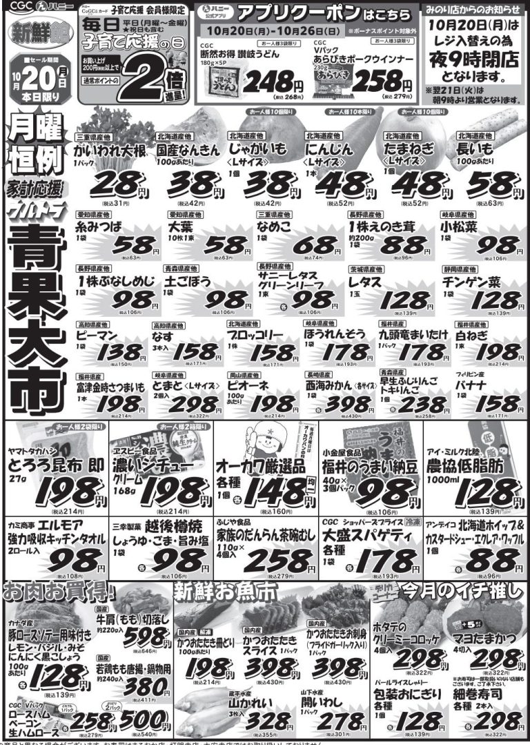 毎週月曜日は青果の日 毎週火曜日はシルバーデー 毎週水曜日は100円均一 毎週水曜日はカラーレシート発行日 毎週木曜日はポイント券ご使用日 毎週金曜日は玉子の日 毎週土曜日は100ポイント券ご使用日 毎月15日は特別シルバーデー 月~金曜日子育て応援の日 |