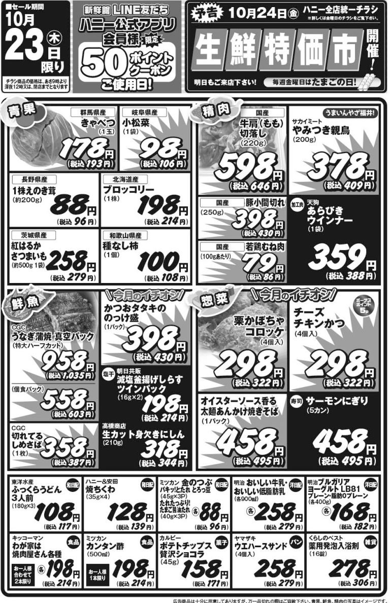 毎週月曜日は青果の日 毎週火曜日はシルバーデー 毎週水曜日は100円均一 毎週水曜日はカラーレシート発行日 毎週木曜日はポイント券ご使用日 毎週金曜日は玉子の日 毎週土曜日は100ポイント券ご使用日 毎月15日は特別シルバーデー 月~金曜日子育て応援の日 |