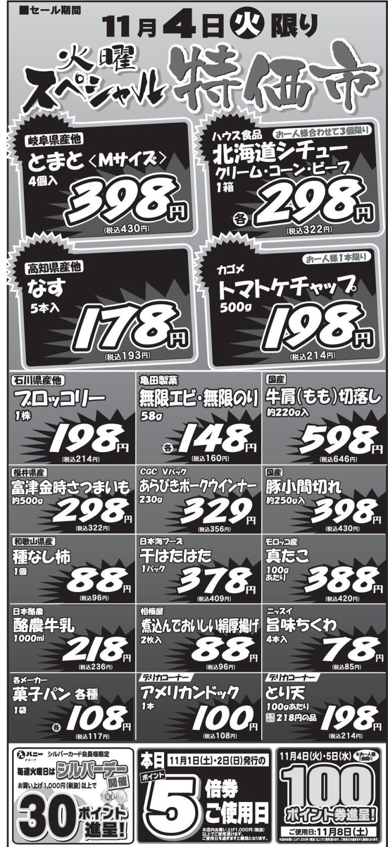 毎週月曜日は青果の日 毎週火曜日はシルバーデー 毎週水曜日は100円均一 毎週水曜日はカラーレシート発行日 毎週木曜日はポイント券ご使用日 毎週金曜日は玉子の日 毎週土曜日は100ポイント券ご使用日 毎月15日は特別シルバーデー 月~金曜日子育て応援の日  |
