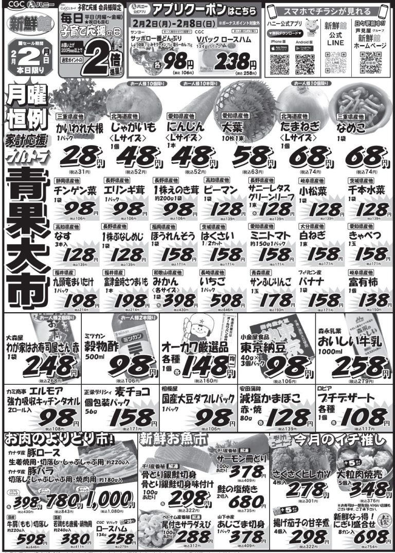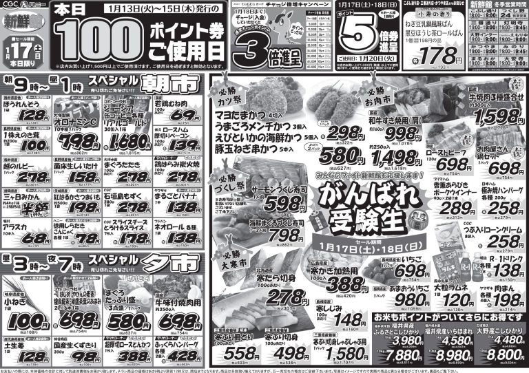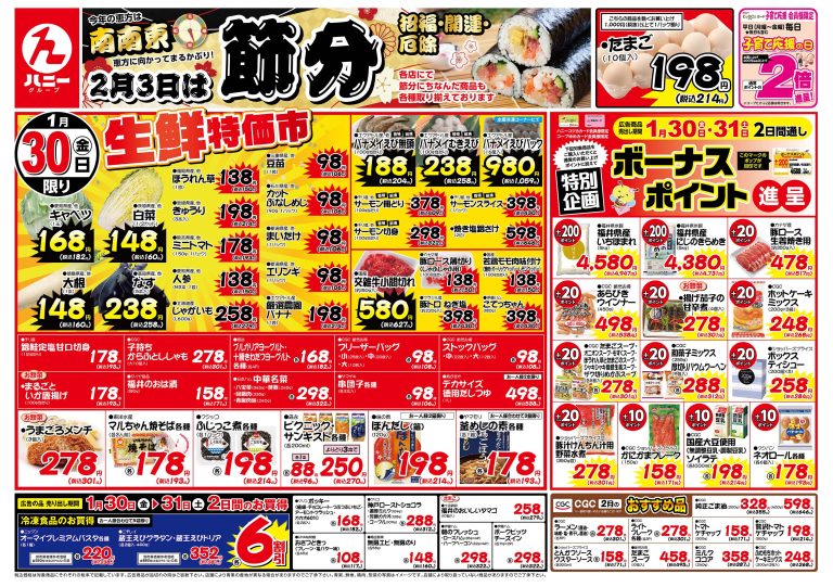 毎週月曜日は青果の日 毎週火曜日はシルバーデー 毎週水曜日は100円均一 毎週水曜日はカラーレシート発行日 毎週木曜日はポイント券ご使用日 毎週金曜日は玉子の日 毎週土曜日は100ポイント券ご使用日 毎月15日は特別シルバーデー 月~金曜日子育て応援の日 |