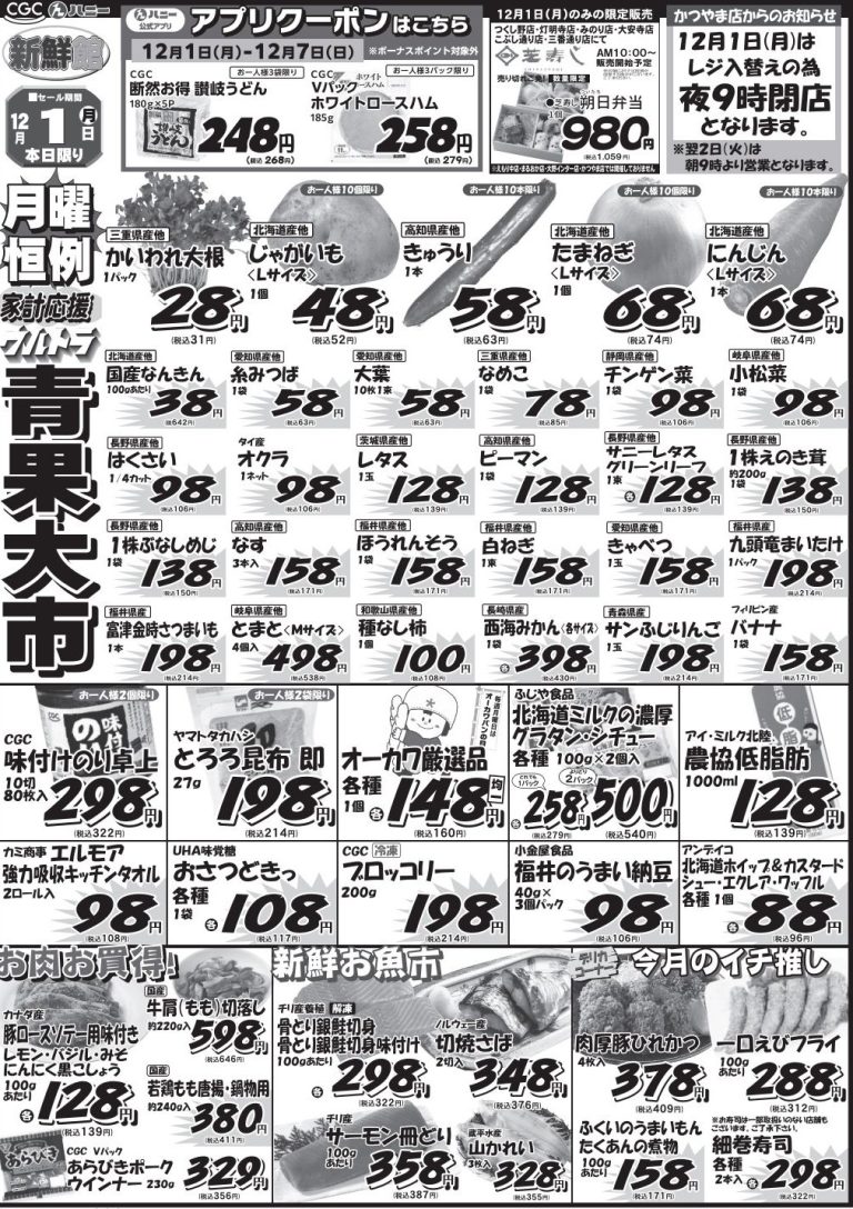 毎週月曜日は青果の日 毎週火曜日はシルバーデー 毎週水曜日は100円均一 毎週水曜日はカラーレシート発行日 毎週木曜日はポイント券ご使用日 毎週金曜日は玉子の日 毎週土曜日は100ポイント券ご使用日 毎月15日は特別シルバーデー 月~金曜日子育て応援の日 |
