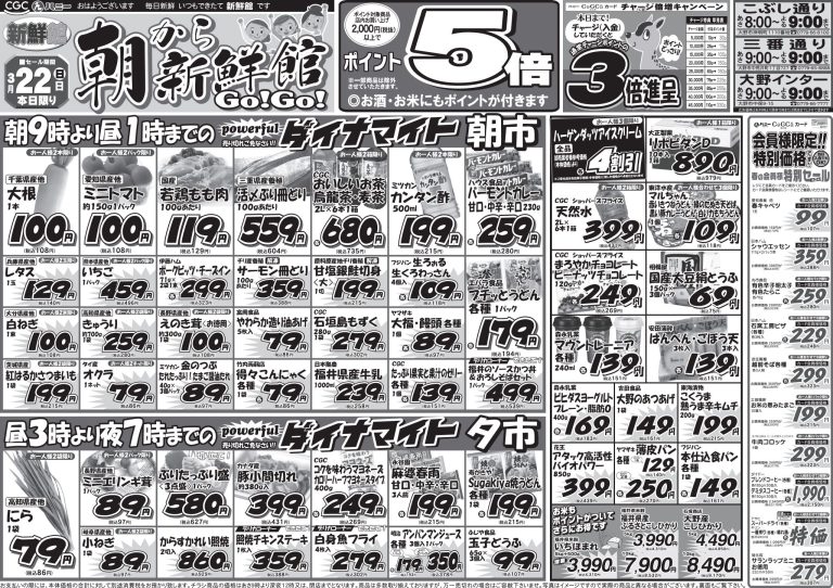 毎週月曜日は青果の日 毎週火曜日はシルバーデー 毎週水曜日は100円均一 毎週水曜日はカラーレシート発行日 毎週木曜日はポイント券ご使用日 毎週金曜日は玉子の日 毎週土曜日は100ポイント券ご使用日 毎月15日は特別シルバーデー 月~金曜日子育て応援の日 |