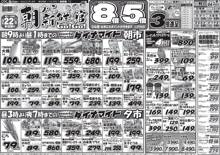 毎週月曜日は青果の日 毎週火曜日はシルバーデー 毎週水曜日は100円均一 毎週水曜日はカラーレシート発行日 毎週木曜日はポイント券ご使用日 毎週金曜日は玉子の日 毎週土曜日は100ポイント券ご使用日 毎月15日は特別シルバーデー 月~金曜日子育て応援の日 |